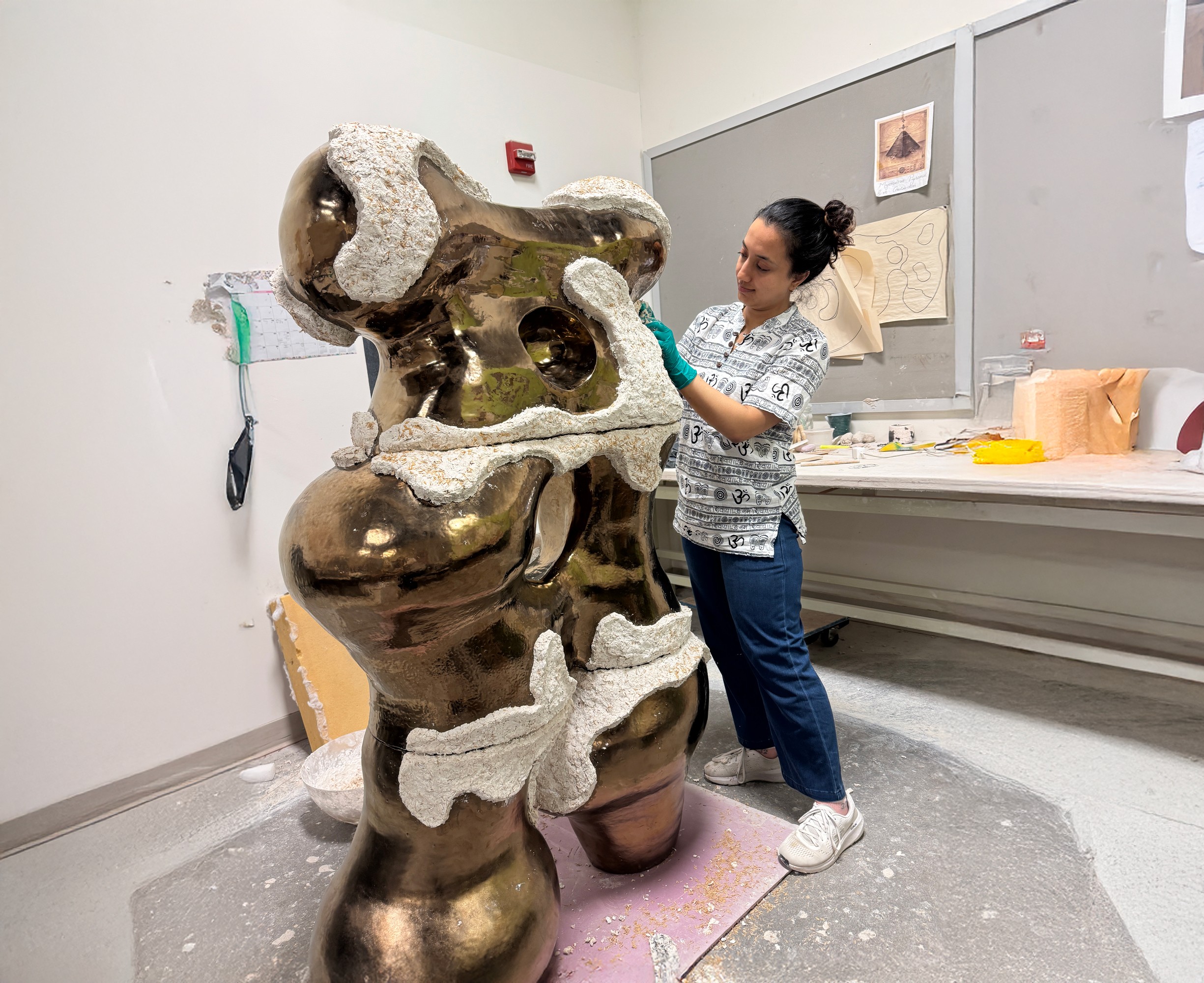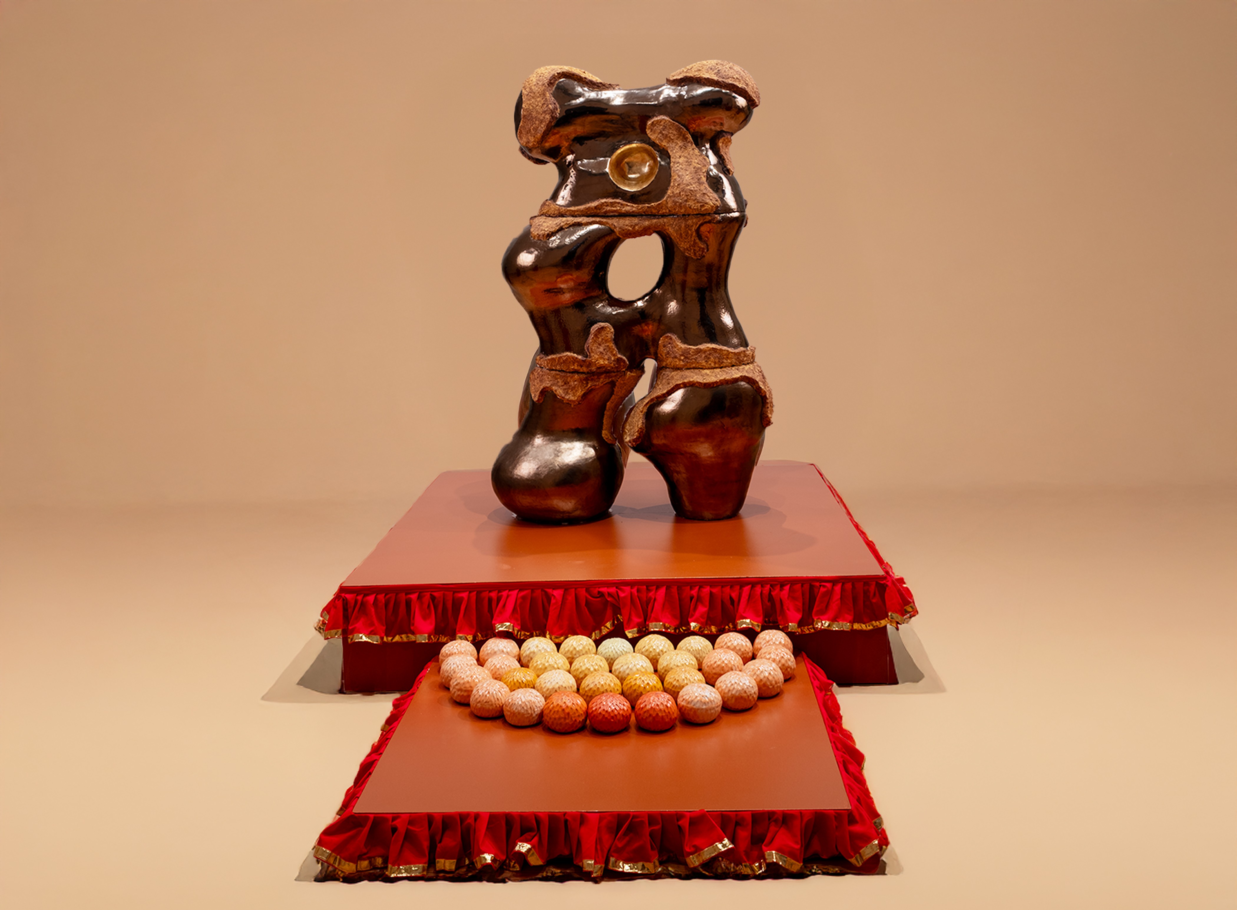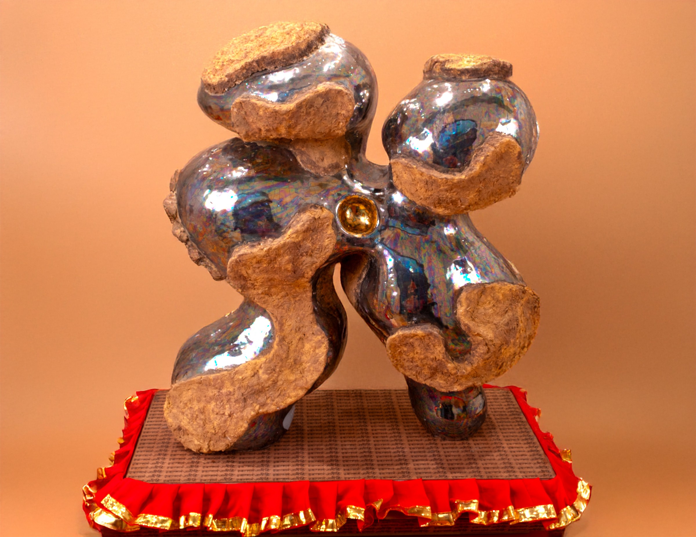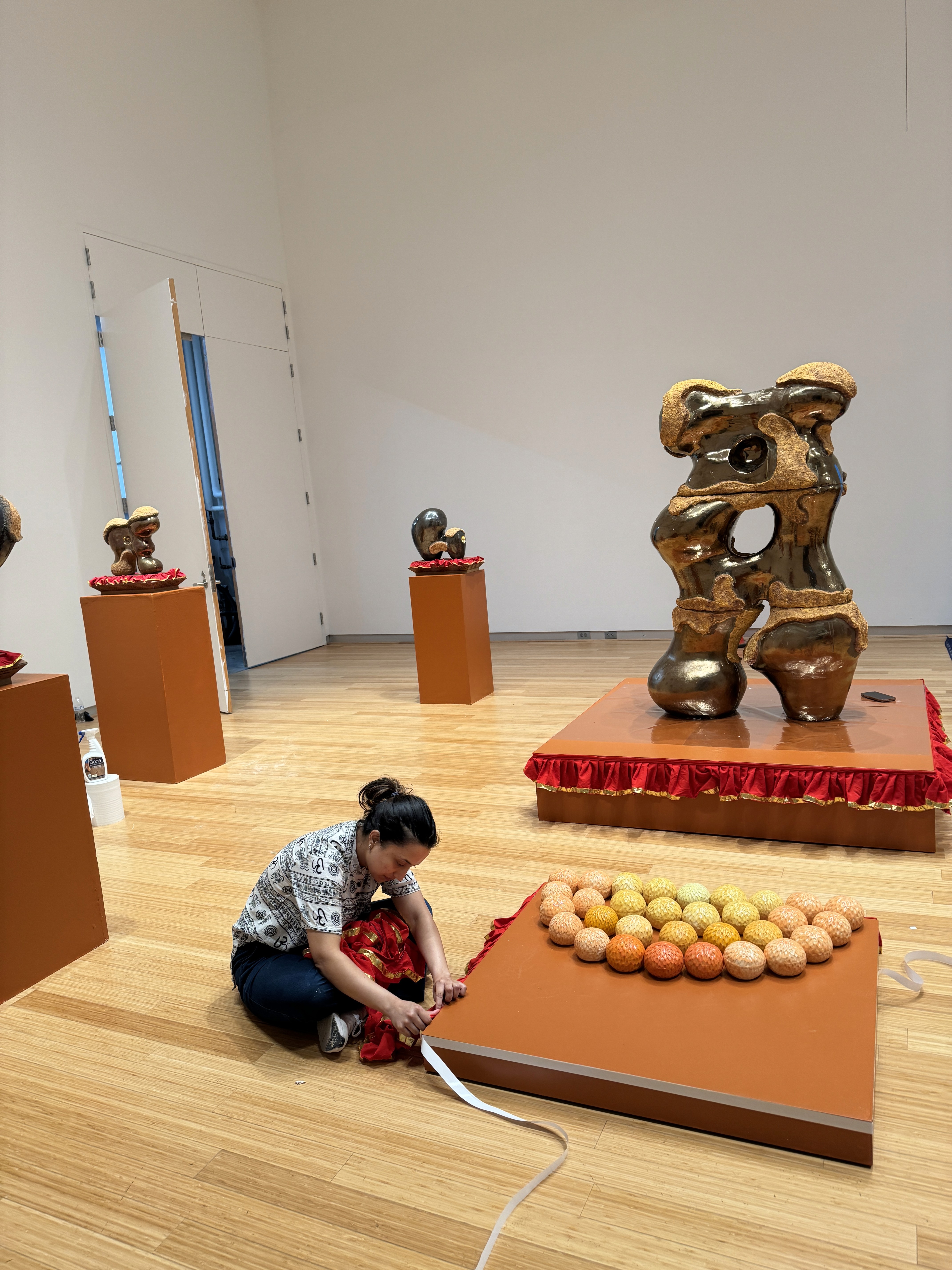 In Sacred Radiance, I return to the inner terrain, where form dissolves into energy, and the seen meets the unseen. This body of work is a continuation of my mining series, now illuminated by gestures, pigments, and a deeper invocation of ancestral memory. Each sculpture unfolds like a mantra in motion- gestural forms that hold breath and silence, tension and release. The spaces carved between curves are not voids, but living presences, portals of absence that invite stillness, reflection, and possibility. Color moves like energy across the work. Seven chromatic echoes, drawn from the spectrum of self, shimmer across the surfaces of my new addition of sculpture. The spectrum is not decorative, but alchemical: a meditation on how inner frequency shapes outer form. The pedestals are painted in the deep red earth of Nepal, a hue drawn from the ritual painting of village homes, where soil becomes sacred during festivals and transitions. This grounding red is more than a foundation, it is a prayer whispered through generations, now holding contemporary form. Threaded through the work are the marigolds, not in bloom, but in spirit. In Nepal, they are offerings, tokens of devotion, celebration, and reverence. Here, their shifting shades of yellow and saffron speak to enlightenment as the dawning of awareness, the warmth of divine presence. At the center stands a singular, monumental form—larger than the rest, yet still. It holds the weight of the series, yet floats in meaning. This sculpture embodies the truth that we are more than our flesh-bound shape, we are vast, luminous, and immeasurable. We are energy, rhythm, and light, pulsing just beyond the limits of perception. Sacred Radiance is a quiet celebration of that inner expanse, an invitation to remember what lies within the folds of breath, ritual, and spirit.