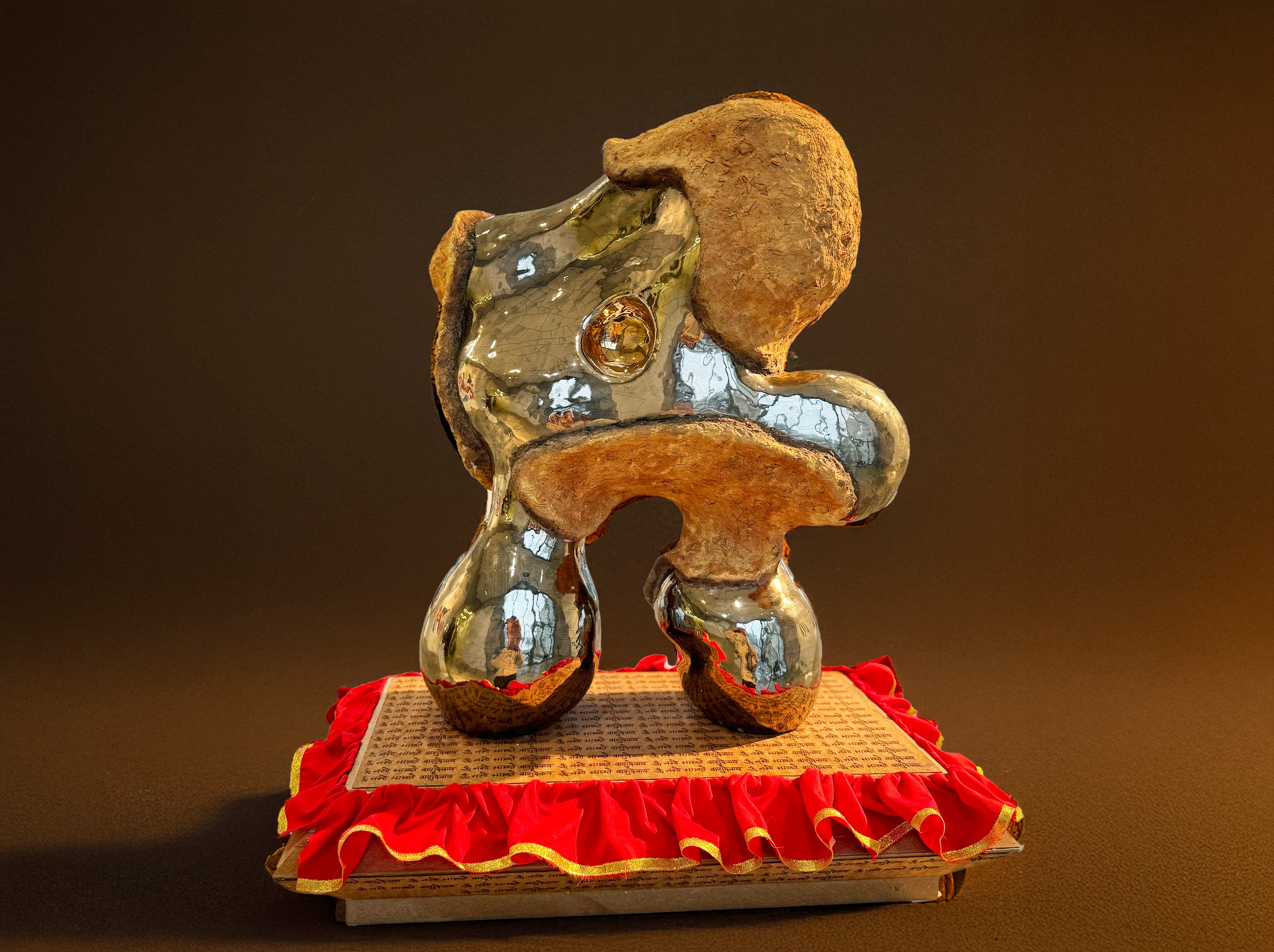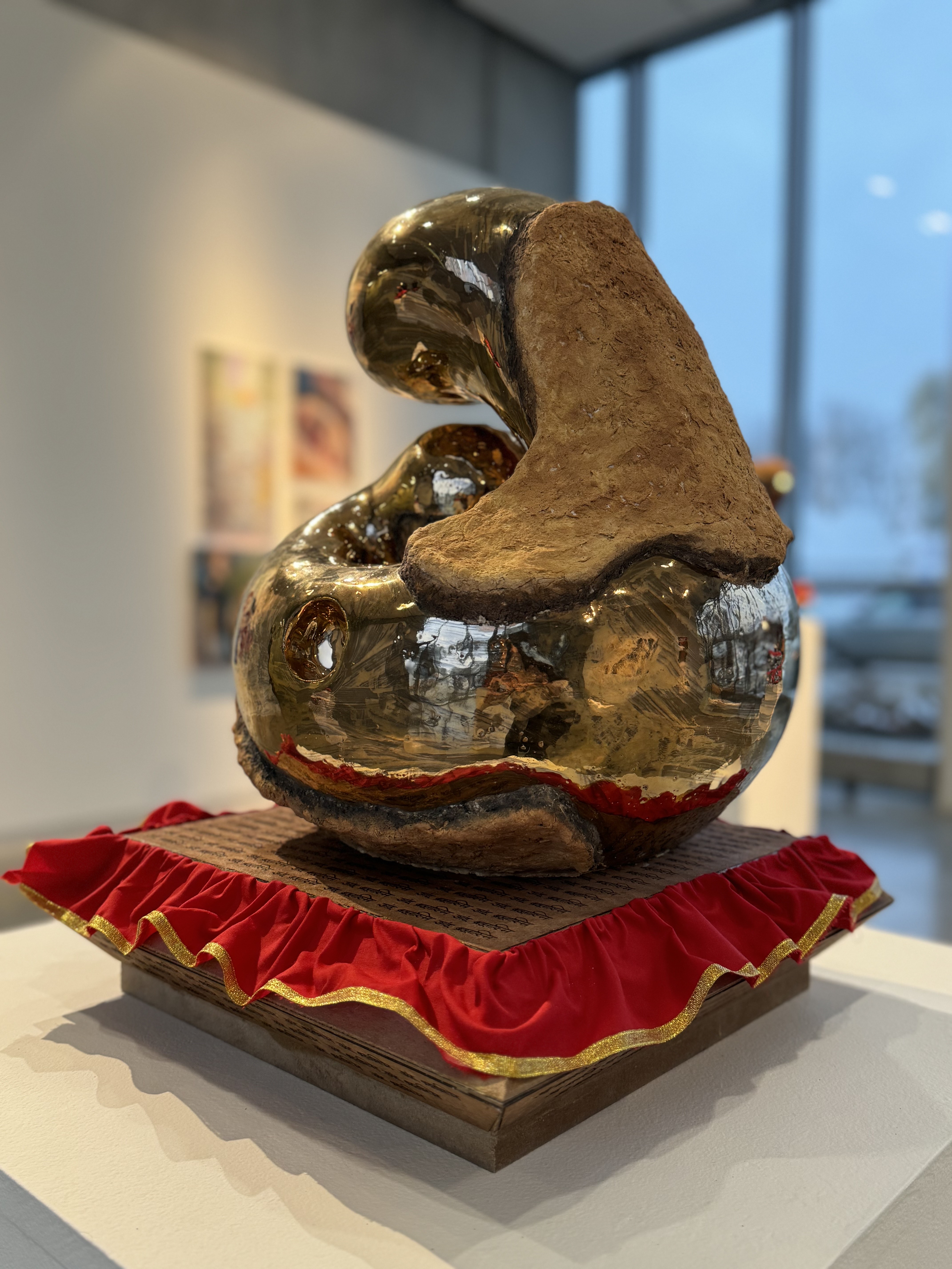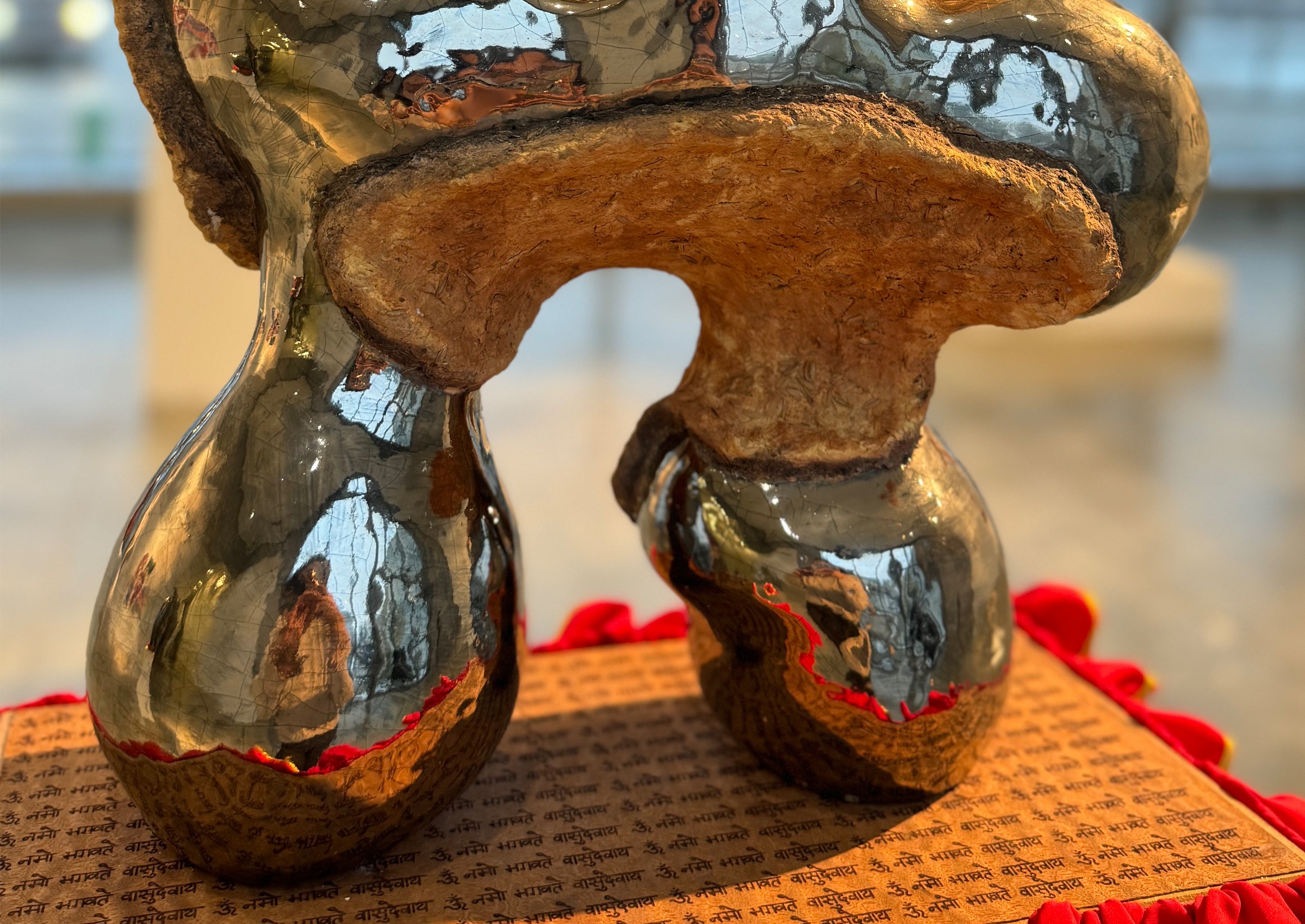 The architecture and rituals of Nepal express an ancient language, crafted through the unity of natural materials and layered histories. Growing up surrounded by these settings, I was involved in the sacred spaces where rituals and daily life merged. It created an environment that felt less like religious duty and more like a way of being. The presence of Sanskrit scripts, and traditional sculpture represents more than heritage. They reflect an identity that continues to shape me, even as I’ve journeyed far from home. These elements, treasured in both physical and spiritual dimensions, connect me to my roots. My work references the traditional Nepalese lost-wax bronze casting technique, drawing parallels as a craft and metaphor. Using the five sacred known metals (gold, silver, zinc, copper, iron) in yogic gestures, I work with layers of metallic colors to express the in-depth radiance. This process resembles mining and uncovering the transformation from roughness to a polished state that reveals hidden potential. Each layer represents the physical materials that connect to something beyond, blending tangible form with spiritual resonance. Through the contrasts of textures and colors, my work invites viewers to reflect on their layers within, honoring both the physical presence and the deeper story it holds.